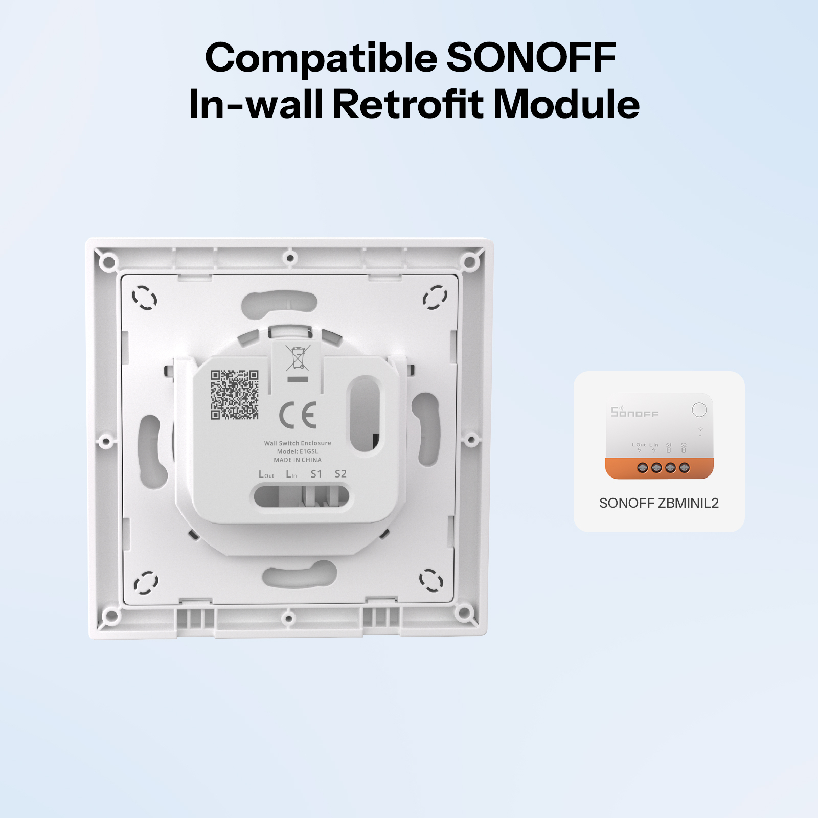 SONOFF E1GSL este o carcasa inteligenta proiectata special pentru montajul modulului SONOFF ZBMINIL2, permitand utilizarea acestuia ca un intrerupator de perete elegant si compact, fara a necesita fir de nul.