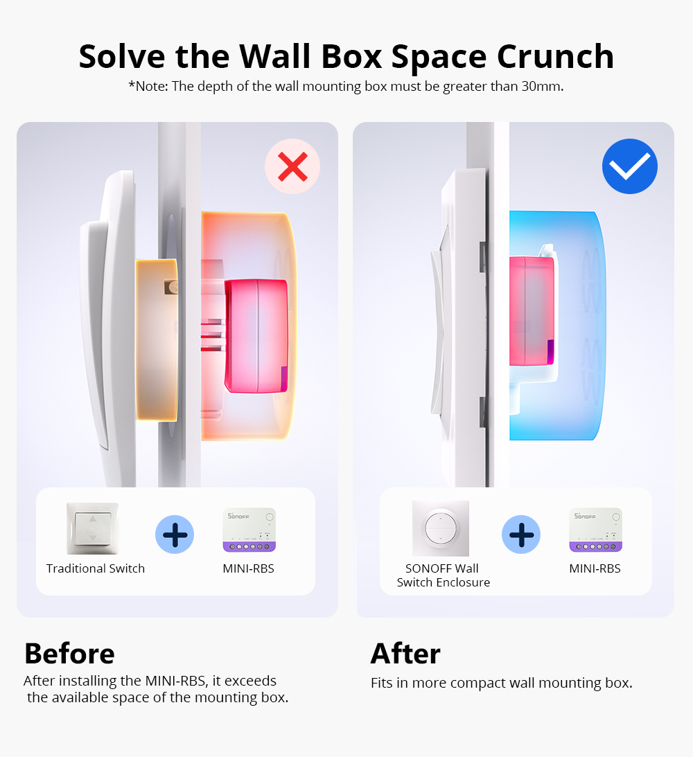 Compatible with SONOFF MINI-ZBRBS (Zigbee) and SONOFF MINI-RBS (Wi-Fi)