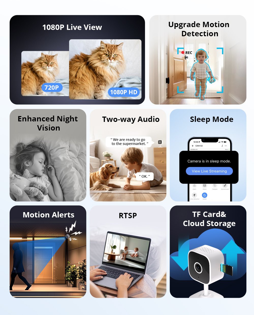 Compatible with Amazon Alexa and Google Assistant, enabling voice-command live streaming. RTSP (Real-Time Streaming Protocol) support allows you to monitor the feed from a PC, offering greater surveillance flexibility.
