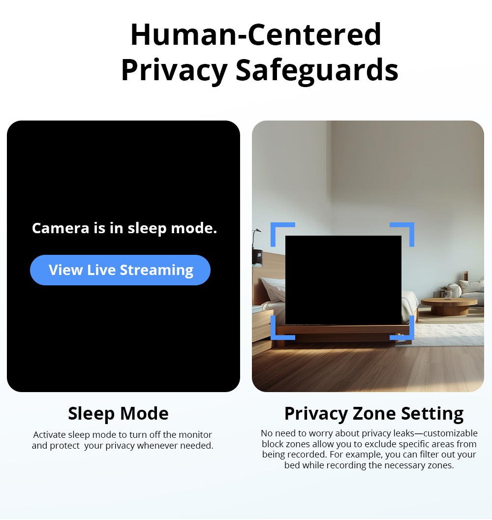The programmable sleep mode lets you disable monitoring at specific times, ensuring privacy for your family. Additionally, privacy zones allow you to exclude certain areas from the camera’s field of view, preventing recording in those spaces.