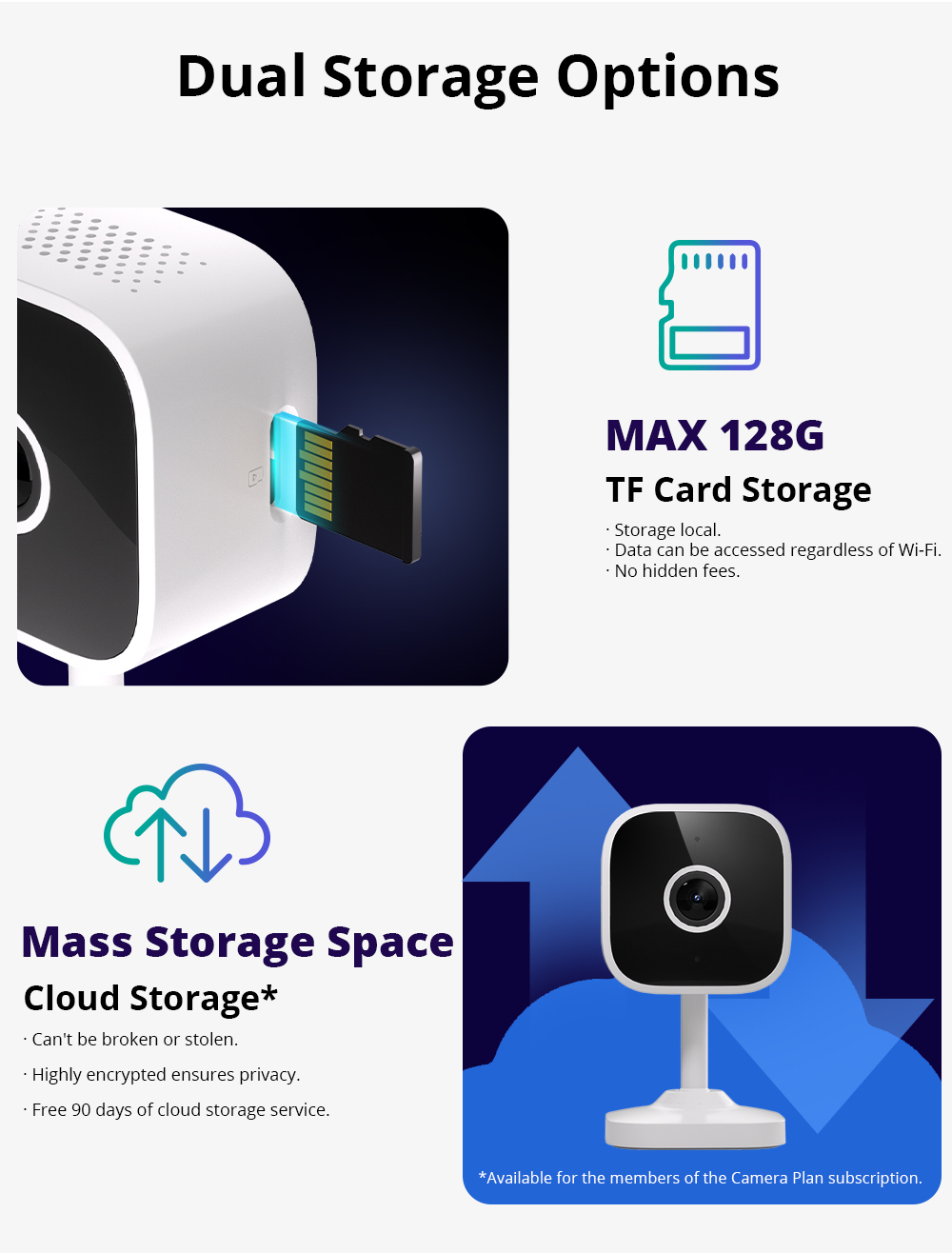 Choose between local storage on a microSD card (up to 128GB) or cloud storage via eWeLink, with a 90-day free trial for the annual plan or 30-day trial for the monthly plan.